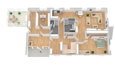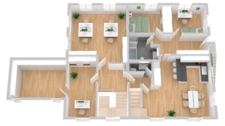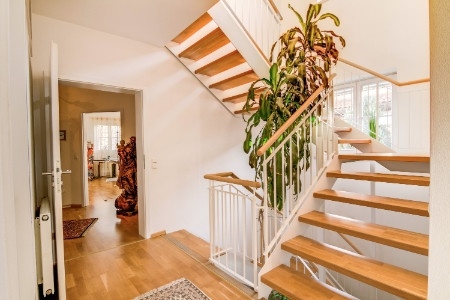 Über einen zentralen Eingangsbereich kommen Sie in die ca. 80 m² Büro- und Sozialräume des Erdgeschosses (mit Zugang zur/von der Produktions-/Lagerhalle) sowie zu den Räumlichkeiten des Erdgeschosses, aktuell noch als großzügige 2,5-Zimmer-Wohnung mit ca. 112 m² genutzt, die primär als Büro- oder Gewerbefläche bspw. für Ausstellungen vorgesehen ist und zum Treppenhaus. Dieses führt zu weiteren Büroräumen mit aktuell ca. 80 m² im Obergeschoß sowie zur Eigentümer-/Mitarbeiterwohnung, die aktuell als 5,5-Zimmer--Wohnung mit ca. 160 m² Wohnfläche im 1.OG und Dachgeschoß genutzt wird. Diese Wohnung verfügt außerdem über einen eigenen Aussenzugang und im Dachgeschoß einer Süd-Loggia und kann ebenfalls als Büro/Gewerbeflächen genutzt werden.