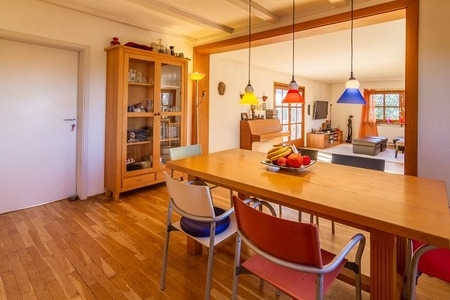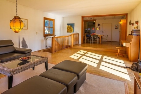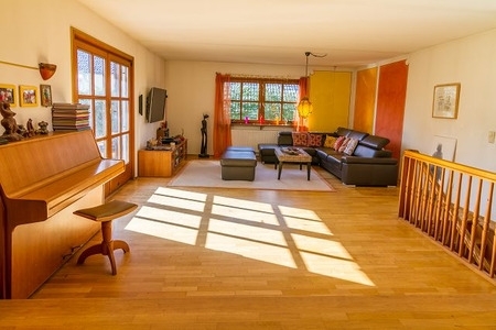 Auf einem 1.000 m² großen Grundstück mit leichter Hanglage wurde Ende der 60er Jahre ein Isartaler Holzhaus mit den Aussenmaßen 8x9m errichtet: ca. 105 m² Wohnfläche verteilen sich auf Erdgeschoss und ausgebautes Dachgeschoss. Das Haus wurde komplett unterkellert. Die Heizung wird mit Holz gespeist.1985 wurde auf der Westseite des Bestandes angebaut: Ein ebenerdiger Wohnraum mit ca 30 m² Wohnfläche inklusive ausgebautem Kellerraum, welcher zugängig ist vom Wohnraum und genutzt wird als Gästezimmer.