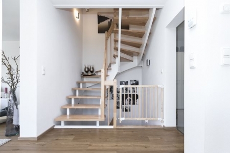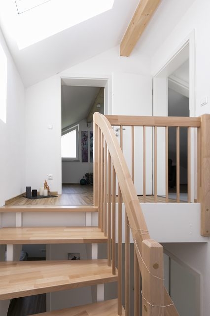 Sonstiges: Treppengeländer und -stufen aus Buche massiv, Oberfläche natur, Treppenwangen aus Buche massiv, Oberfläche weiß lasiert