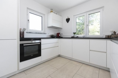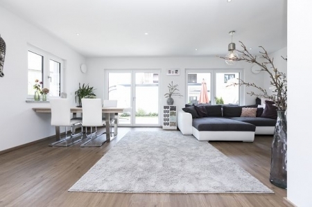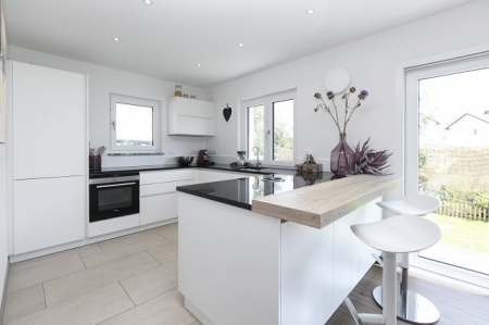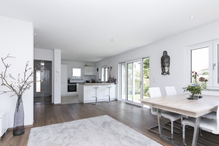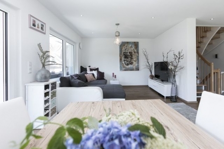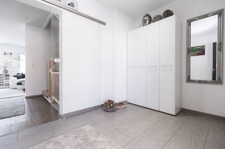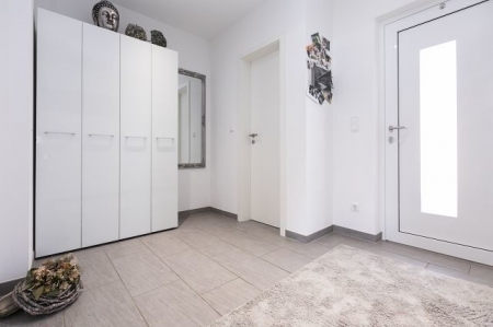Lassen Sie sich begeistern vom durchdachten Grundriss dieser DHH: Die großzügige Diele im Erdgeschoss wirkt beim Betreten sehr einladend, zudem gibt es genug Platz für Garderobe und Schränke. Ein Gäste-WC mit Fenster ist ebenfalls untergebracht. Der offene Küchen-Ess-Wohnbereich im Erdgeschoss bietet hohen Wohnkomfort auf Grund einer komfortablen Einteilung. Durch die großen Fenster und Fenstertüren gewinnt das Haus viel Tageslicht und wirkt zu jeder Tageszeit hell und freundlich.