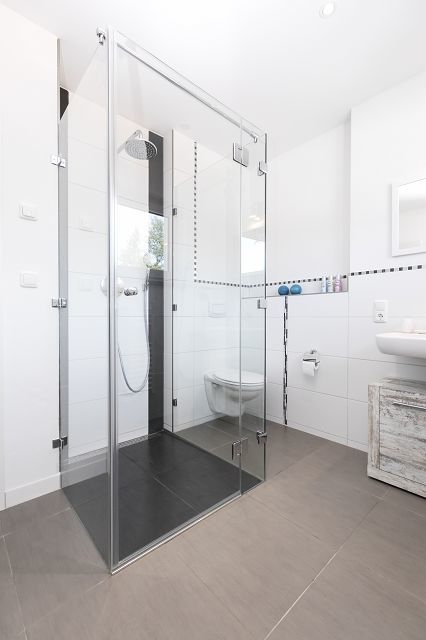 Sonstiges: Wandfliesen weiß, deckenhoch gefliest, barrierefreie Dusche, Deckenspots