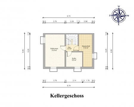 Das gesamte Haus ist voll unterkellert; neben dem Haustechnikraum und einem weiteren Kellerraum gibt es einen Hobbyraum. Der Hobbyraum wird mit ca. 11,7 m² (50 %) zur Wohnfläche gerechnet, der Technikraum im Keller mit ca. 13,6 m² ist Funktionsfläche. Die Treppen im gesamten Haus betragen ca. 13,5 m² und zählen zur Verkehrsfläche. Im Dachgeschoss sind ca. 26 m² der Flächen unter einer Höhe von 1,50 m. Zusammen mit dem Kellerraum mit ca. 8,8 m² beträgt die Nutzfläche insgesamt ca. 62 m².