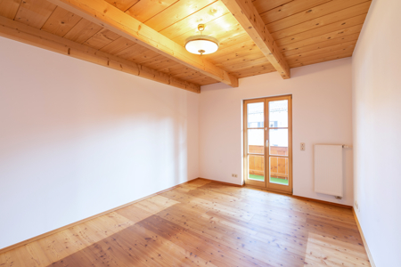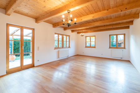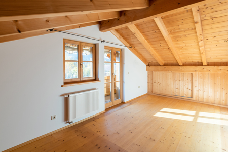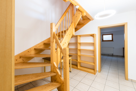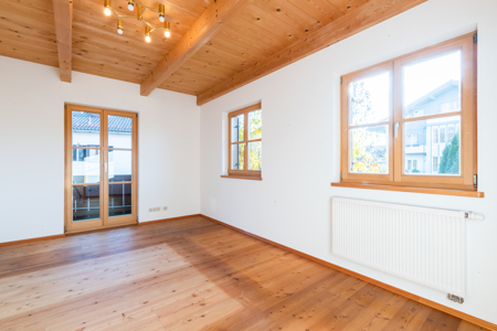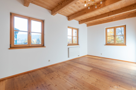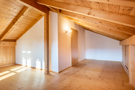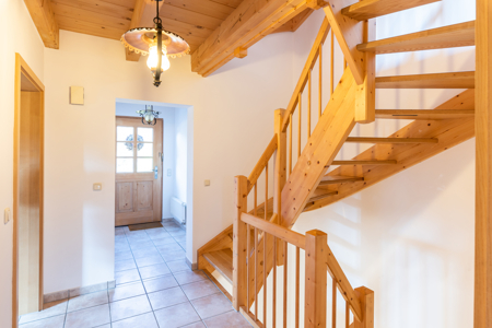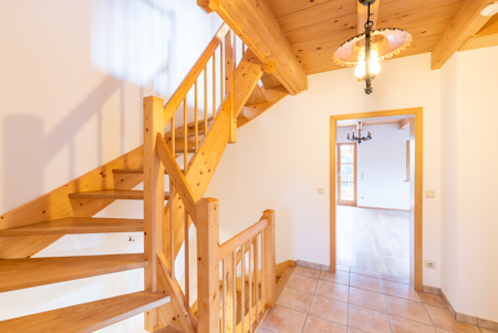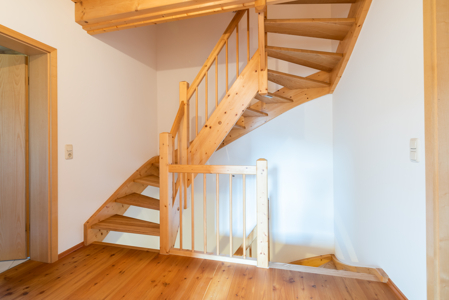 Der Innenausbau ist hochwertig und nachhaltig mit heimischen Hölzern ausgestattet: Das offene Treppenhaus vom Keller bis zum Dachgeschoss mit Treppenstufen aus massiven Eschenholz, die Treppenwangen und das -geländer wie auch die massiven Balkendecken aus Fichtenholz und die Böden in massiver Lärche, bzw. Fichte strahlen Gemütlichkeit und Wärme aus. Ein besonderer Blickfang ist der wärmegedämmte Sichtdachstuhl im ausgebauten Dachgeschoss.