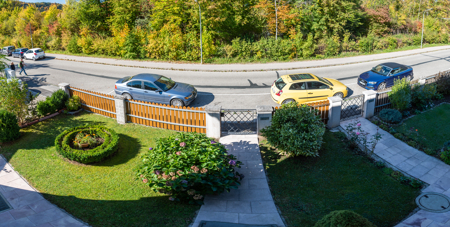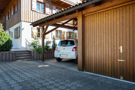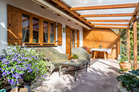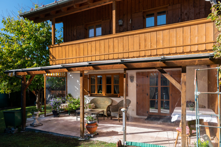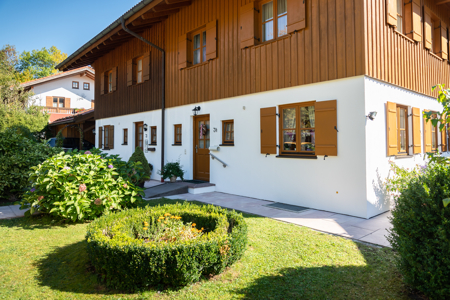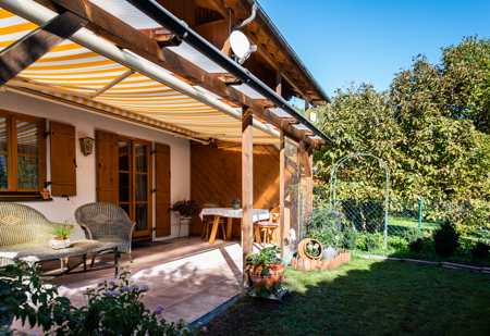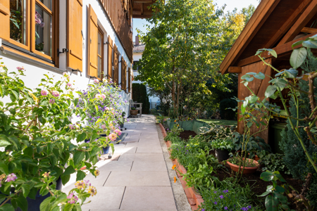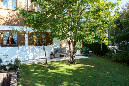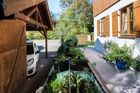 Die überdachte Südterrasse wie auch der Südbalkon sind von der Straße uneinsehbar. Der Garten auf der Westseite mit drei Obstbäumen wie auch der Vorgarten auf der Nordseite des Hauses ist sehr gepflegt und liebevoll angelegt.