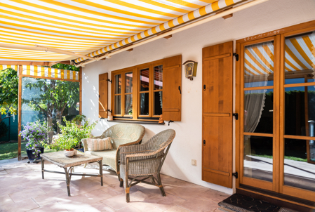 Die Holzfenster sind mit Wärmeschutzglas und mit Fensterläden ausgestattet.