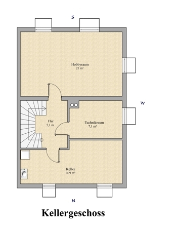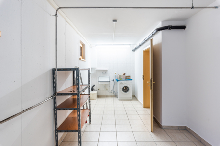 Der Keller mit Hobbyraum, Wasch- und Vorratsraum und einem Technikraum ist komplett gefliest.