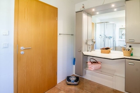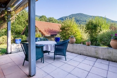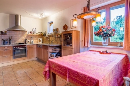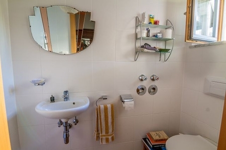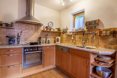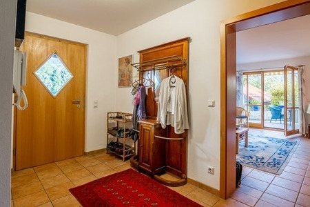 Vom durchdachten Grundriss dieses Hauses werden Sie begeistert sein: Der Eingangsbereich mit Gäste-WC wirkt durch das offene Treppenhaus sehr großzügig, zudem ist im Flur Platz für einen großen Garderobenschrank. In der Wohnküche läßt es sich nicht nur gut kochen, sondern auch gemütlich zusammensitzen. Vom Wohnzimmer aus hat man Zugang auf die Südterrasse mit wunderbarem Blick auf die Vorberge. Wenn die Abende kühler werden, wärmt der Holzofen im Wohnzimmer.