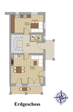 EG mit ca. 60 m² Wohnfläche: Wohnzimmer, Wohnküche, Gäste-WC, Flur und Terrasse