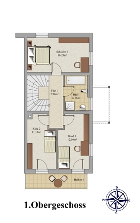 Im Obergeschoss lassen sich drei Zimmer nach Ihren Wünschen und Bedürfnissen nutzen: Ob als Schlafzimmer, Kinderzimmer, Arbeitszimmer oder Ankleidezimmer, das entscheiden Sie. Zusammen mit dem Bad auf der Ostseite und dem Südbalkon ein durchdachtes Wohnkonzept.