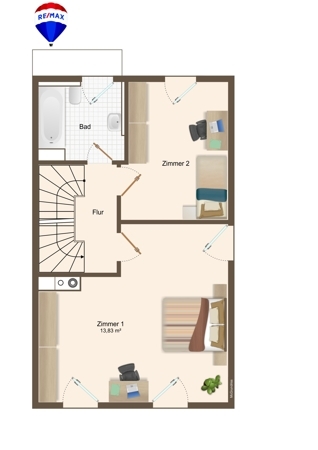Im Obergeschoß findet sich ein großes Bad mit Wanne und Fenster sowie zwei geräumige Schlafzimmer, eines mit Südbalkon.