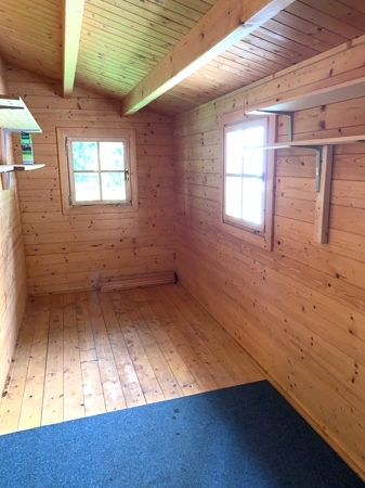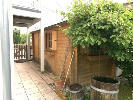 An die Garage angebaut ist ein praktisches massives Gartenhaus für jeglichen Bedarf.