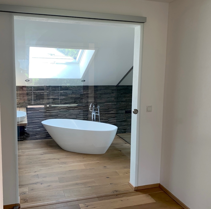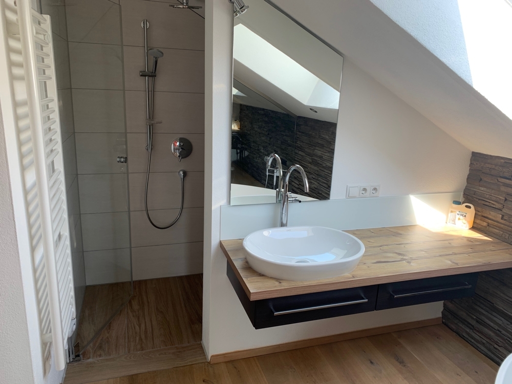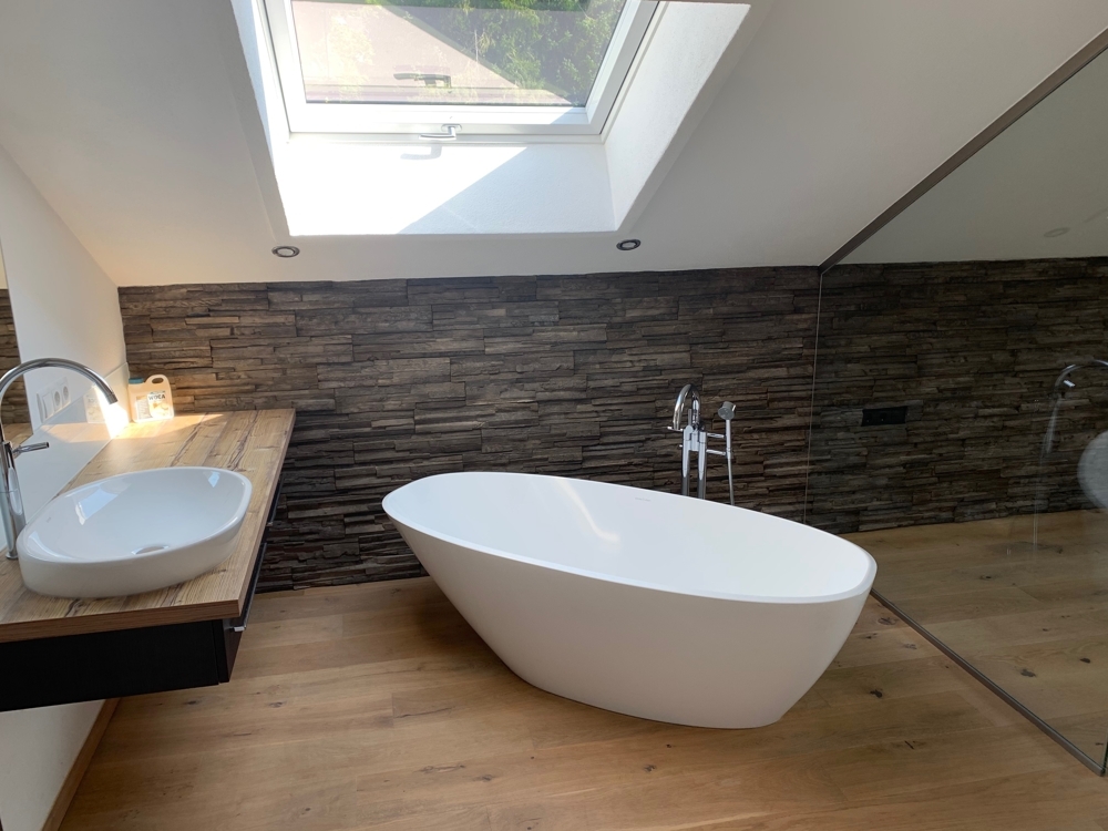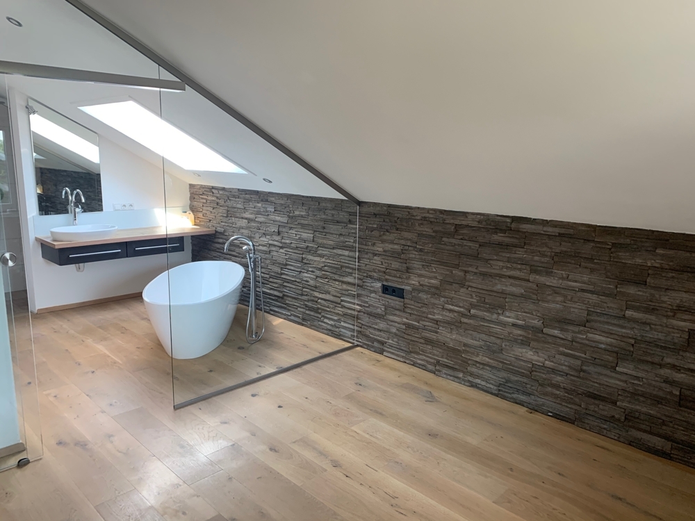 - ein edles Badambiente mit freistehender Wanne und Waschtisch, sowie großer, ebener Dusche mit Glaswänden