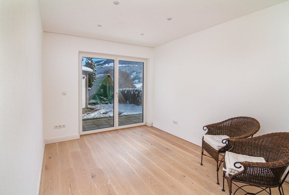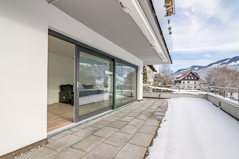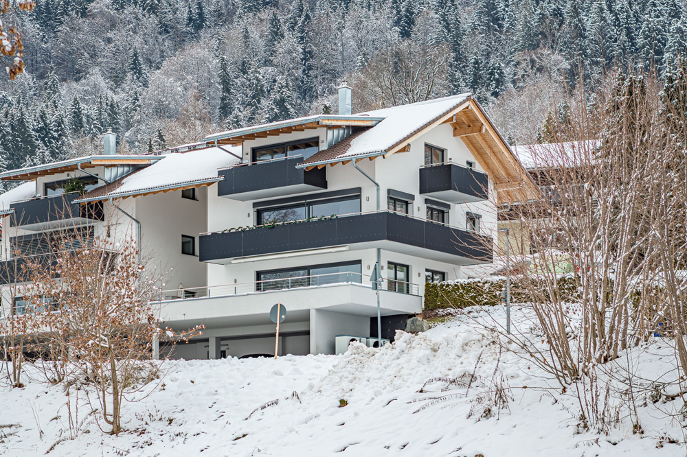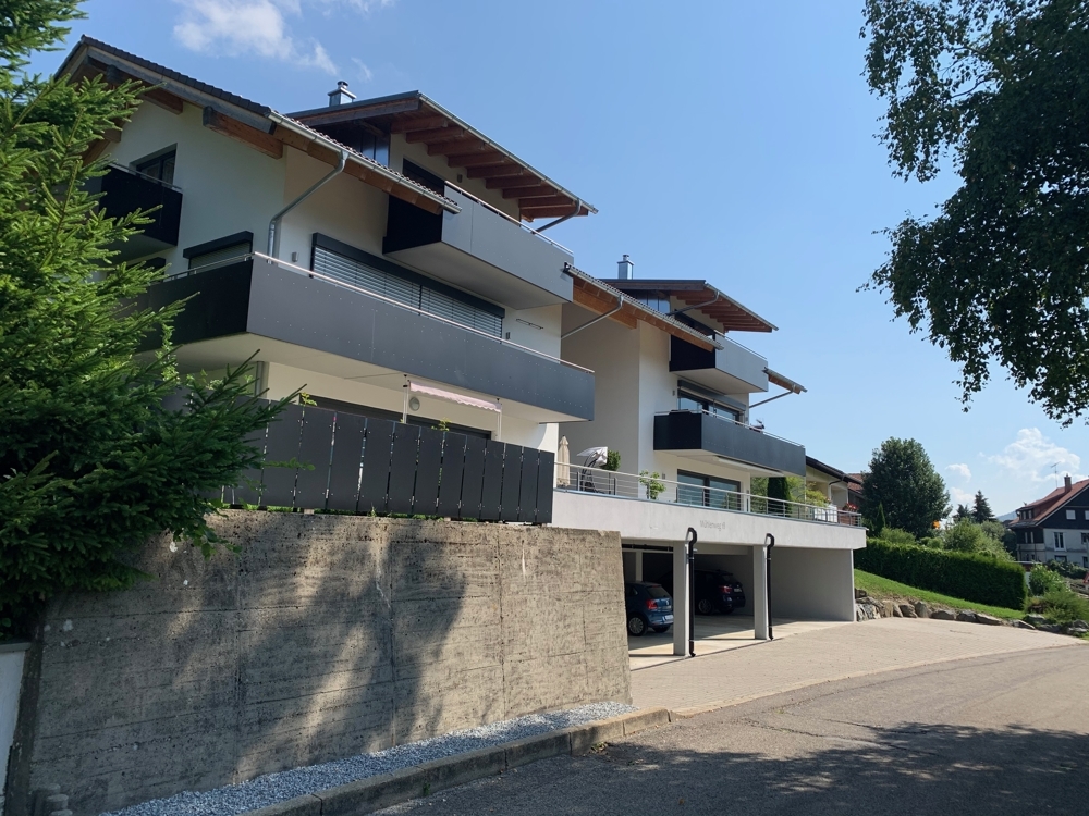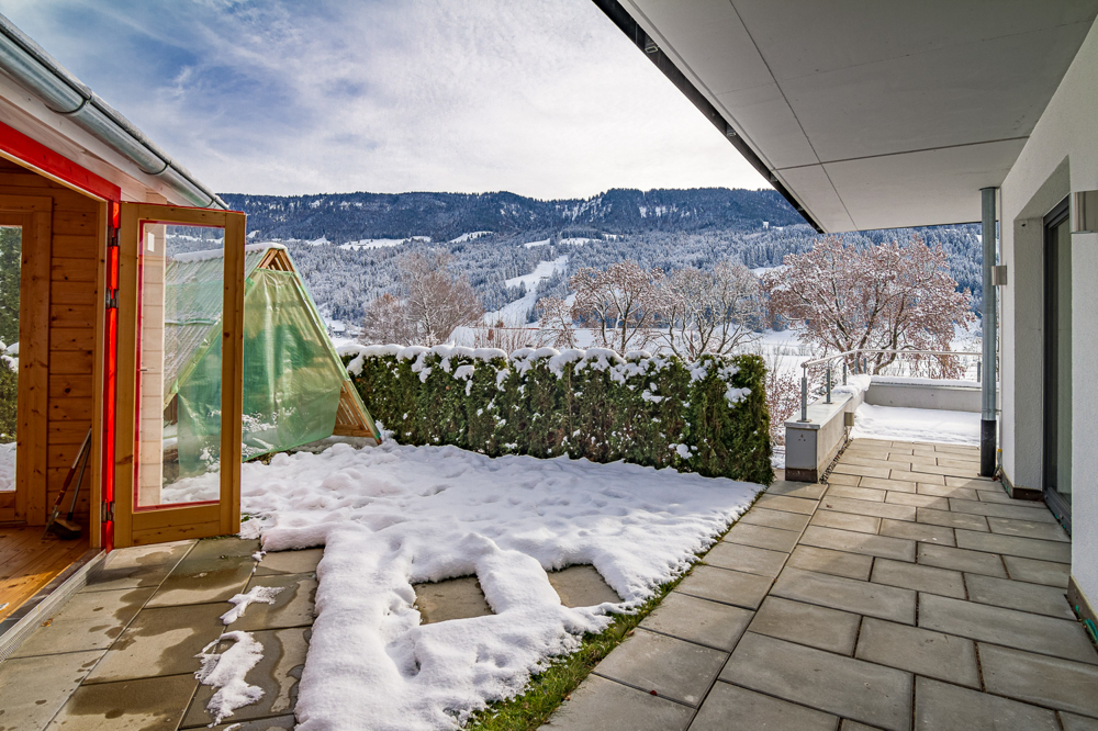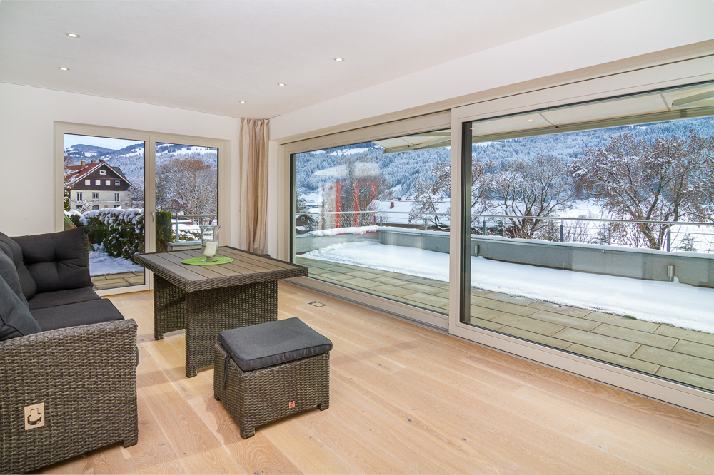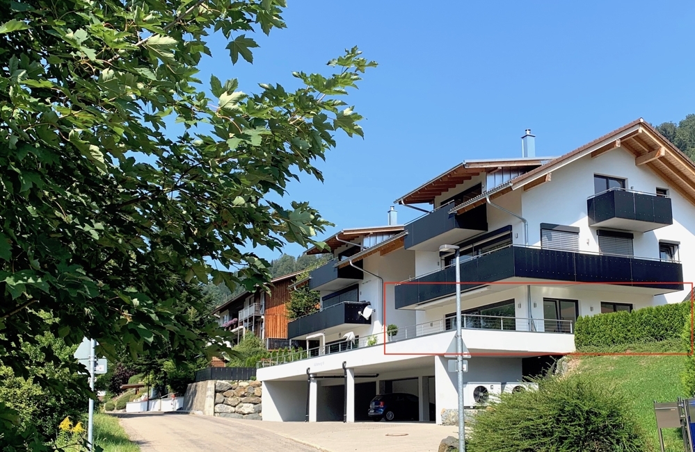 Eine Top-Wohnung im Ortsteil Wiedemannsdorf nahe Oberstaufen: Komfortabler geht es kaum! Superlage im Erdgeschoss mit freiem Blick von der ca. 80 qm großen Terrasse nach Süden.Fahren Sie mit dem Lift von der Tiefgarage in Ihre Wohnung: Exklusiv gestaltet, in offener Bauweise mit großen Fenster- und Türenflächen in den umlaufenden Garten.