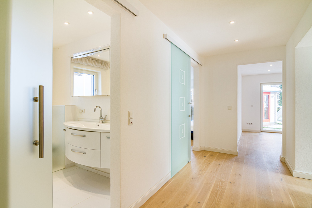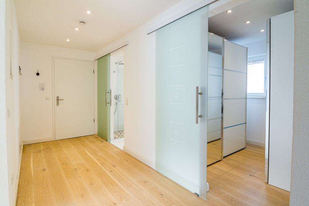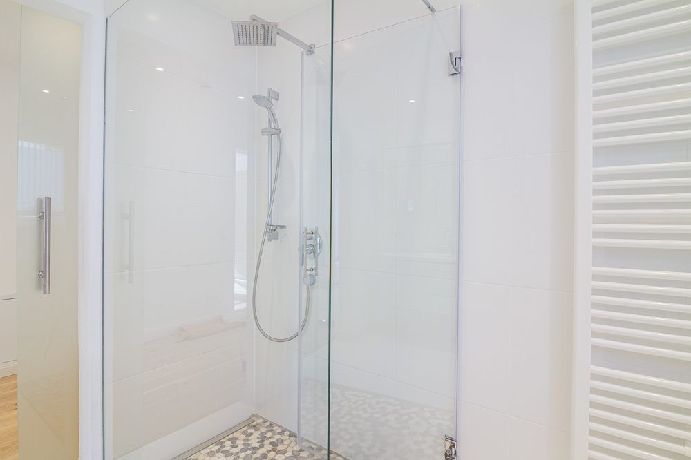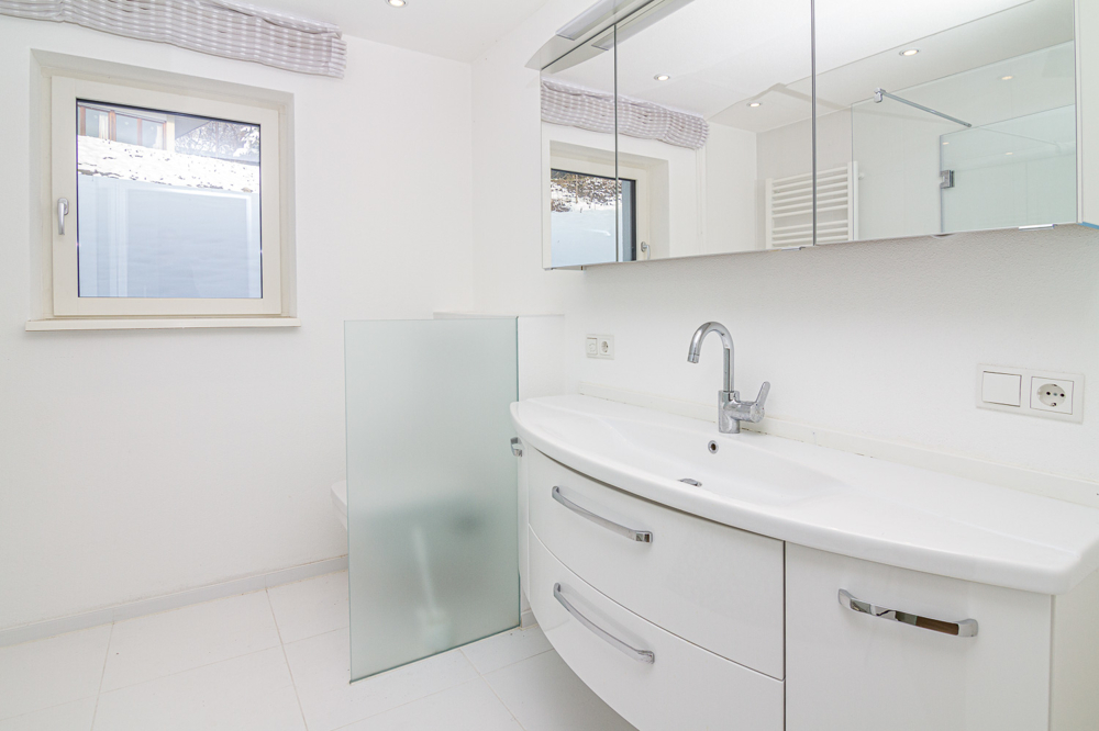 - ein edles Badambiente mit edlem Waschtisch, sowie großer, ebener Dusche mit Glaswänden und Fenster