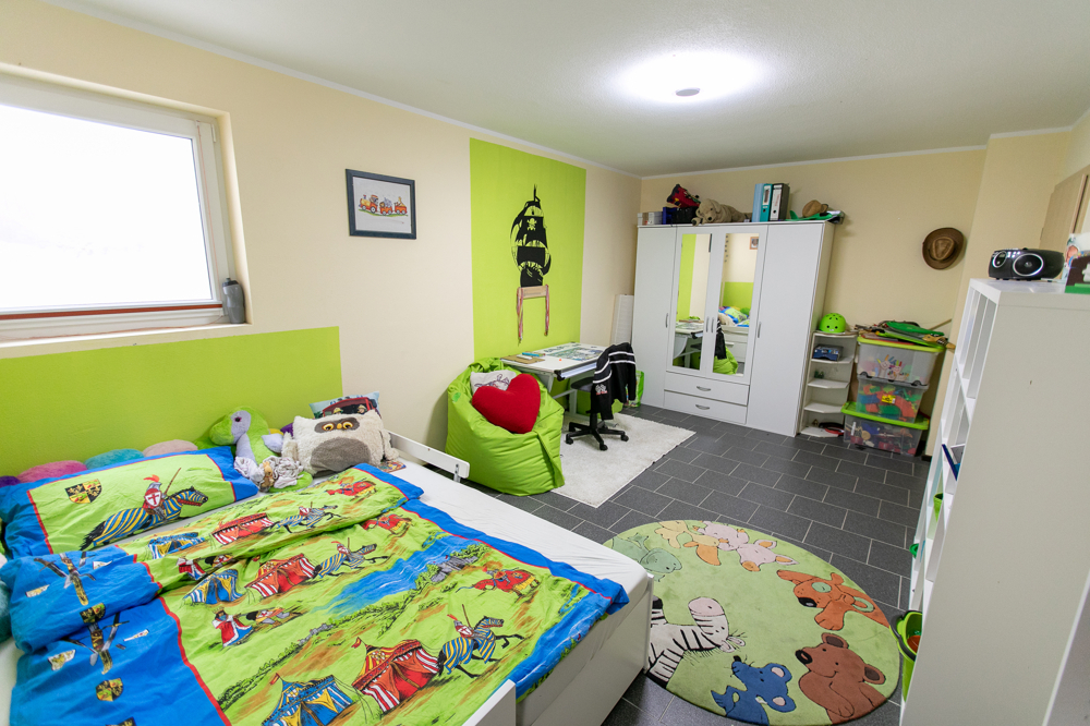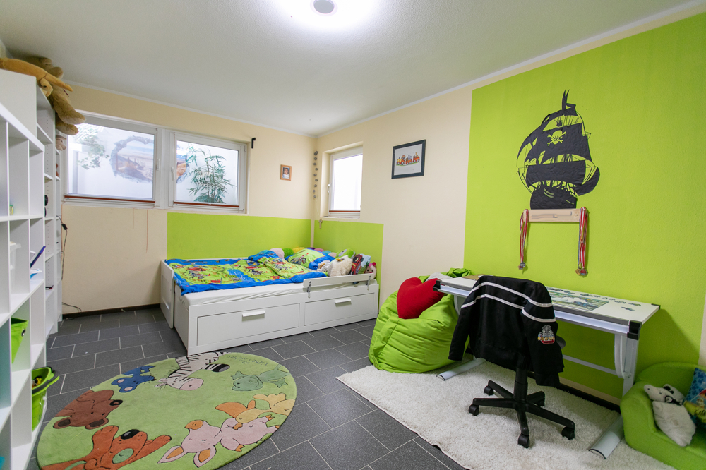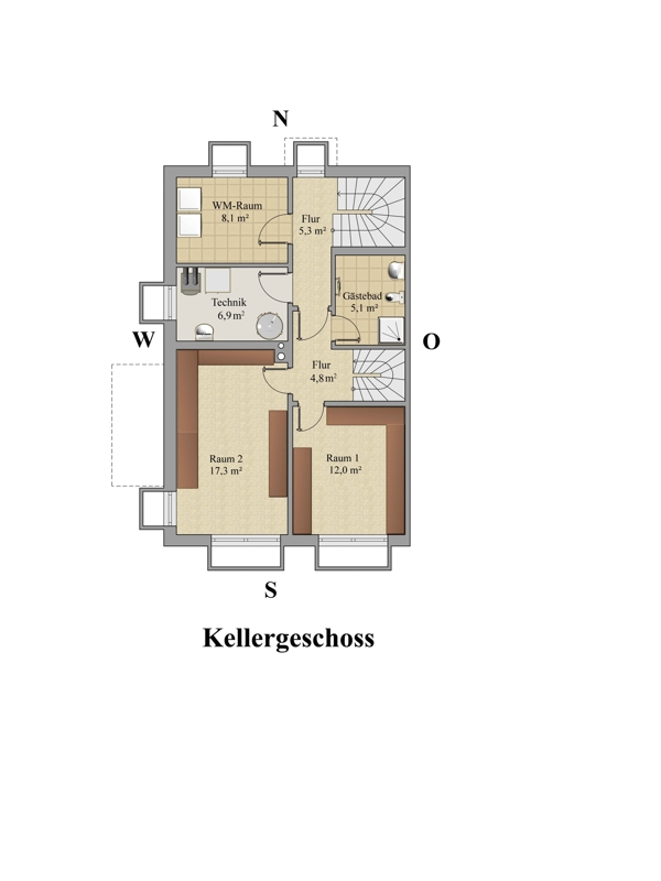 Die Doppelhaushälfte ist komplett unterkellert. Ein Gemeinschafts-Kellerraum steht für beide Wohnungen zum Anschluss für Waschmaschine und Trockner zur Verfügung. Im Technikraum befinden sich u. a. die Heizungsanlage mit Erdwärmepumpe, die Zähler für Strom und Wasser, Boiler, etc.. Zwei weitere ausgebaute Räume im Keller sowie ein Gäste-Bad sind der EG-Wohnung als Nutzfläche zugeordnet; diese Räume sind von der EG-Wohnung über eine massive Holzwendeltreppe erreichbar und vom Gemeinschaftskellerbereich mittels einer Türe getrennt. Die zwei ausgebauten Kellerräume können genutzt werden z.B. als Homeoffice, Hobbyraum, Hauswirtschaftsraum...