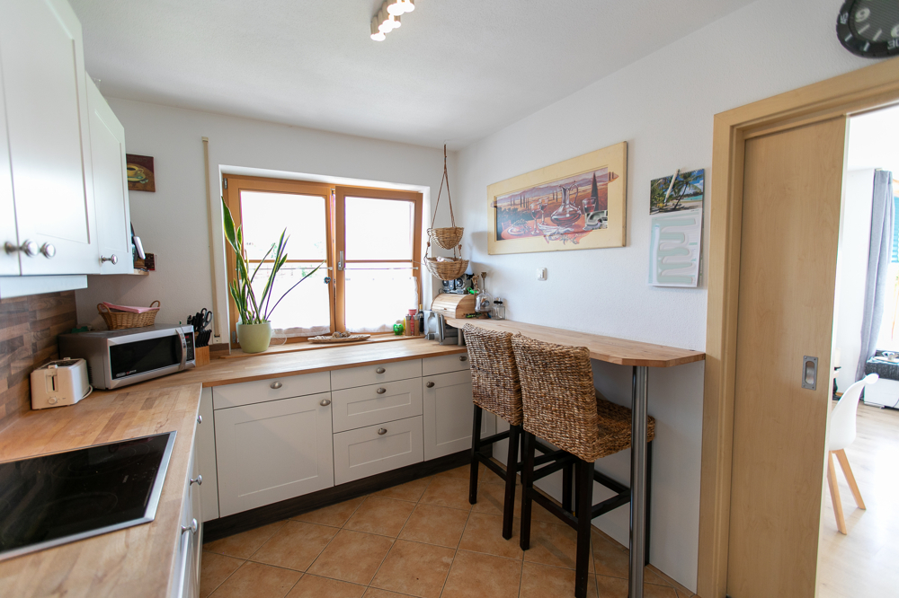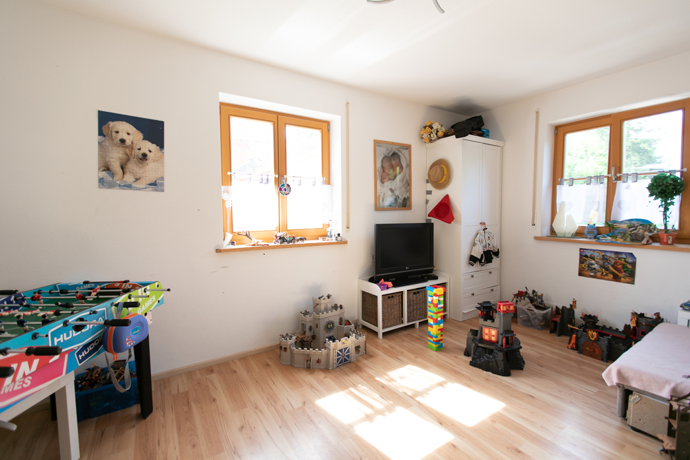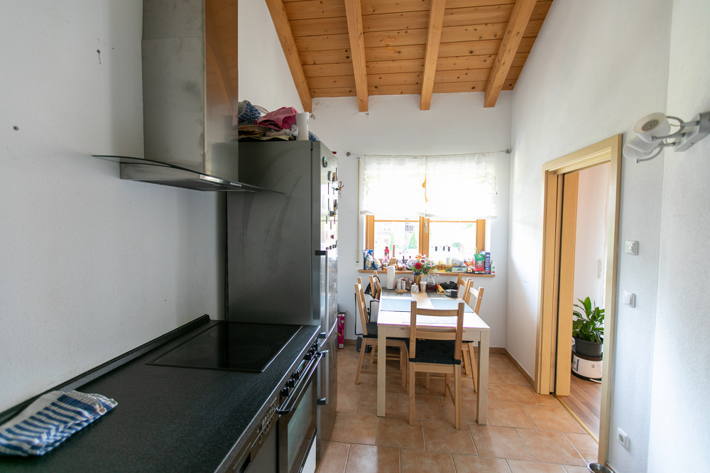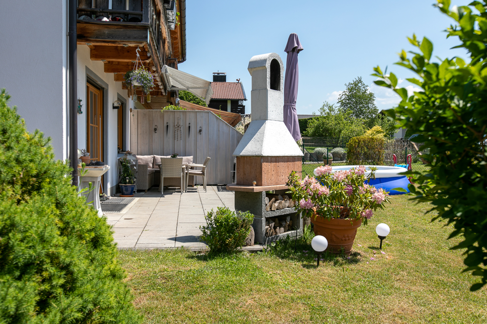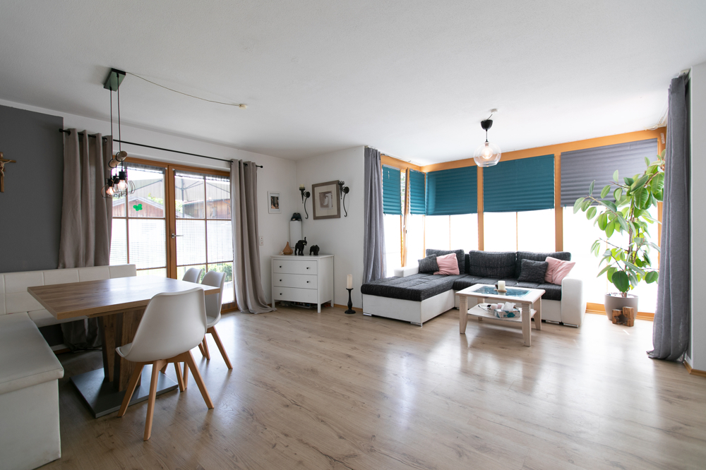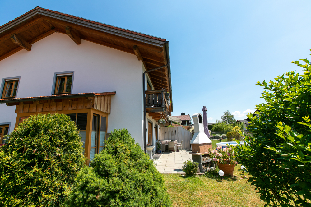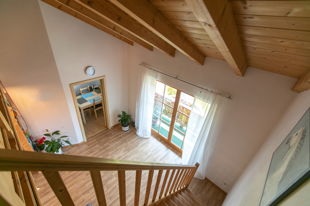 Zur Wohnung im Erdgeschoss gehört der Wintergarten auf der Westseite samt wunderschönem Garten sowie einer großen Südterrasse. Die zweite Wohnung ist im Obergeschoss mit Sichtdachstuhl (Thermodach), Galerie und Südbalkon.