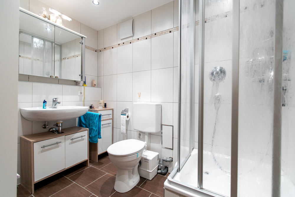 Sonstiges: Dusche, WC, Waschbecken, deckenhoch gefliest, FBH