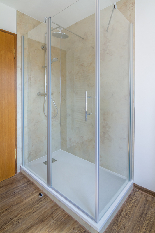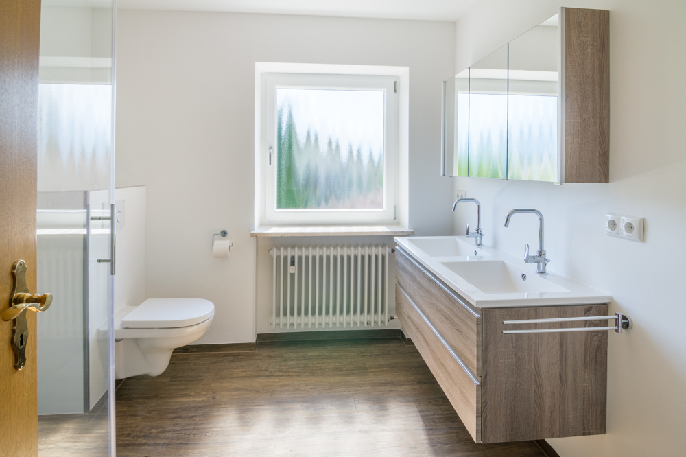 Geräumige Dusche, Doppelwaschtisch, WC, Fenster