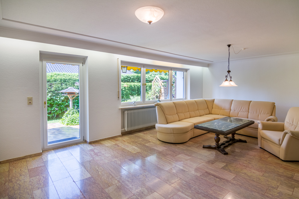 Eine Wohnfläche von knapp 140 m² verteilen sich auf Erdgeschoss und Obergeschoss. Das Erdgeschoss ist eingeteilt in Küche, Esszimmer, Wohnzimmer mit Zugang zur Südterrasse, Garderobe, Gäste-WC und großzügiger Diele.