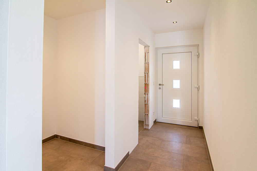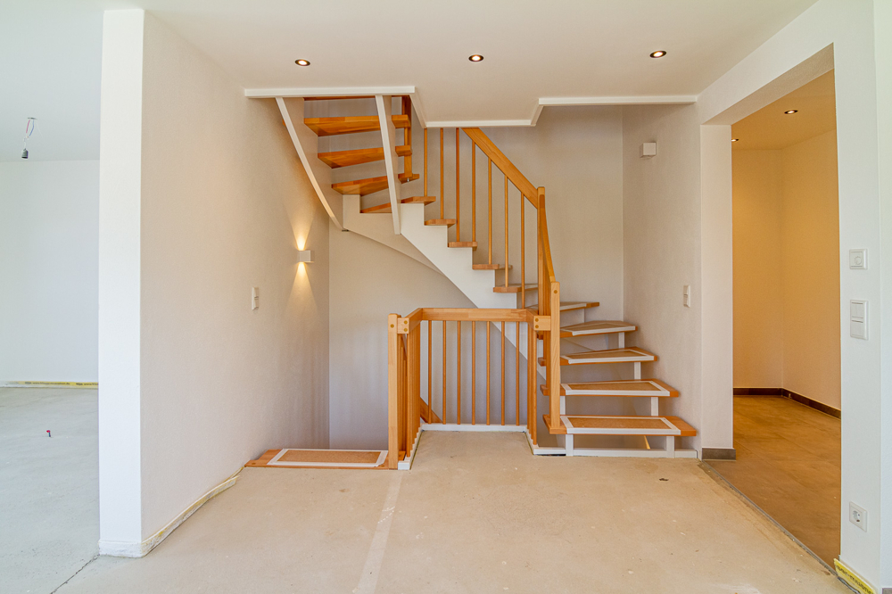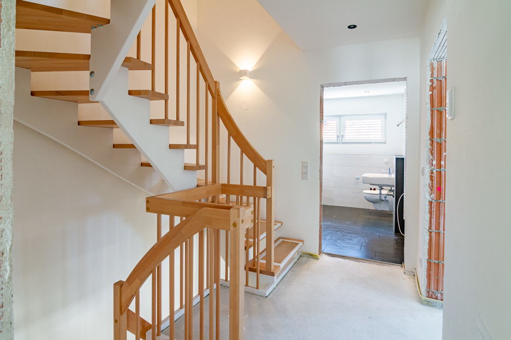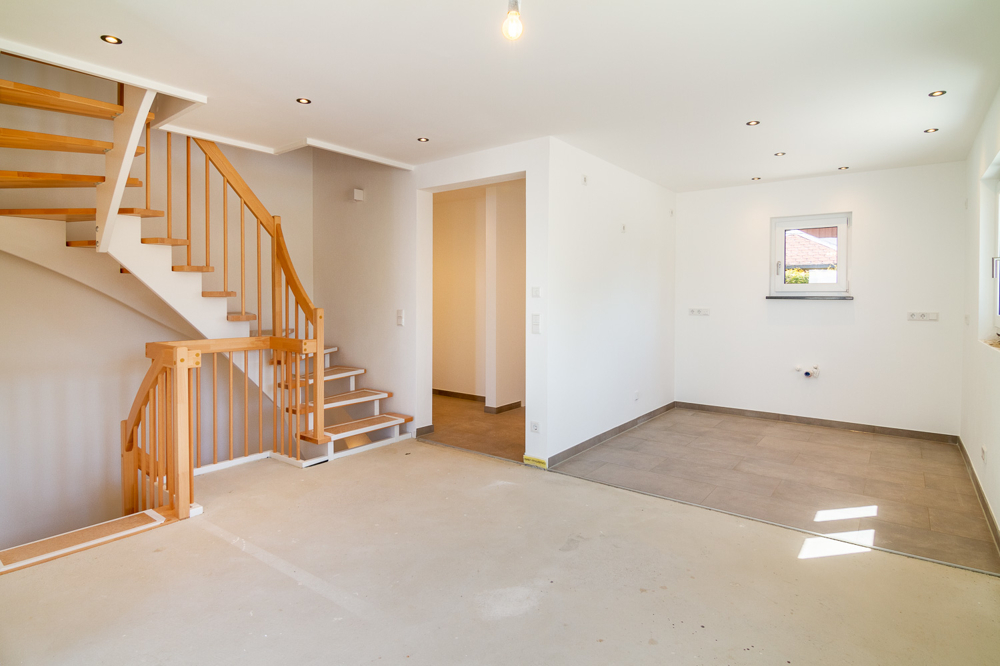Im Kaufpreis nicht enthalten sind die Innentüren und die Bodenbeläge; gefliest sind EG Küche, EG Flur, EG Gäste-WC, OG Bad, DG Bad.