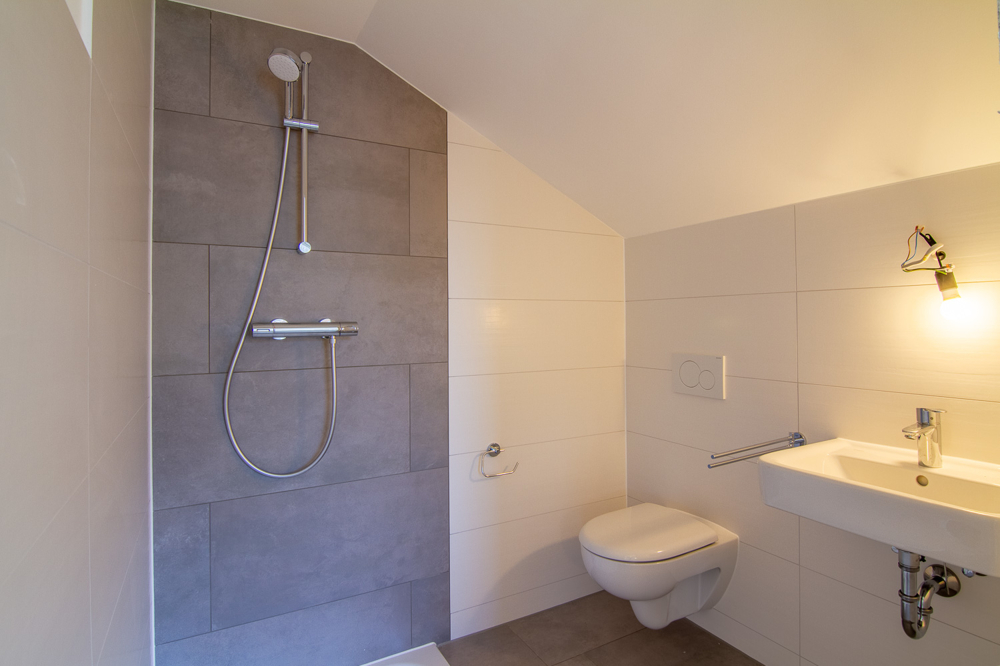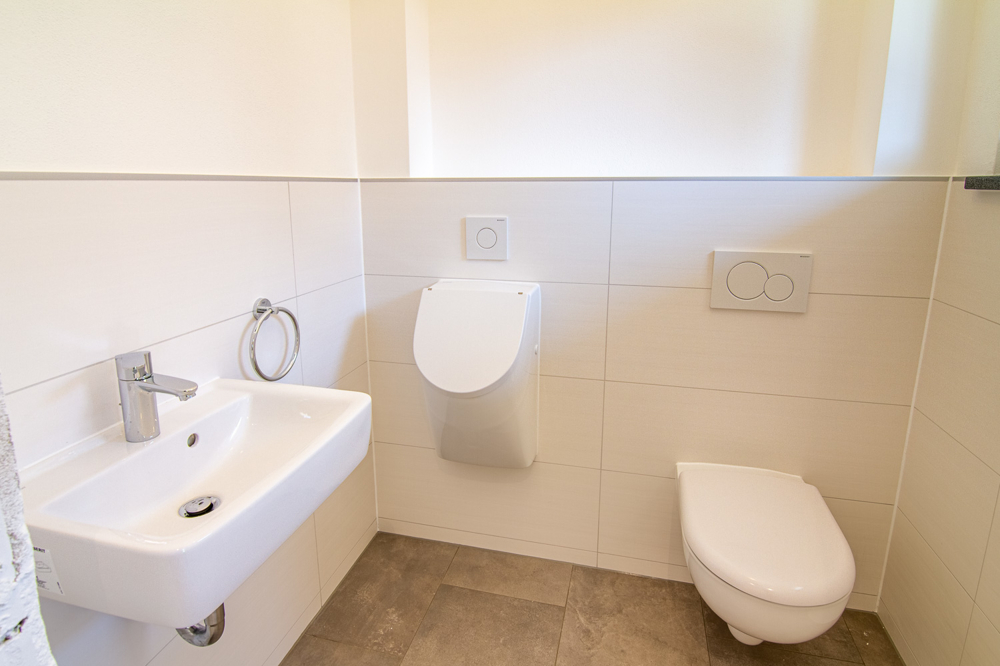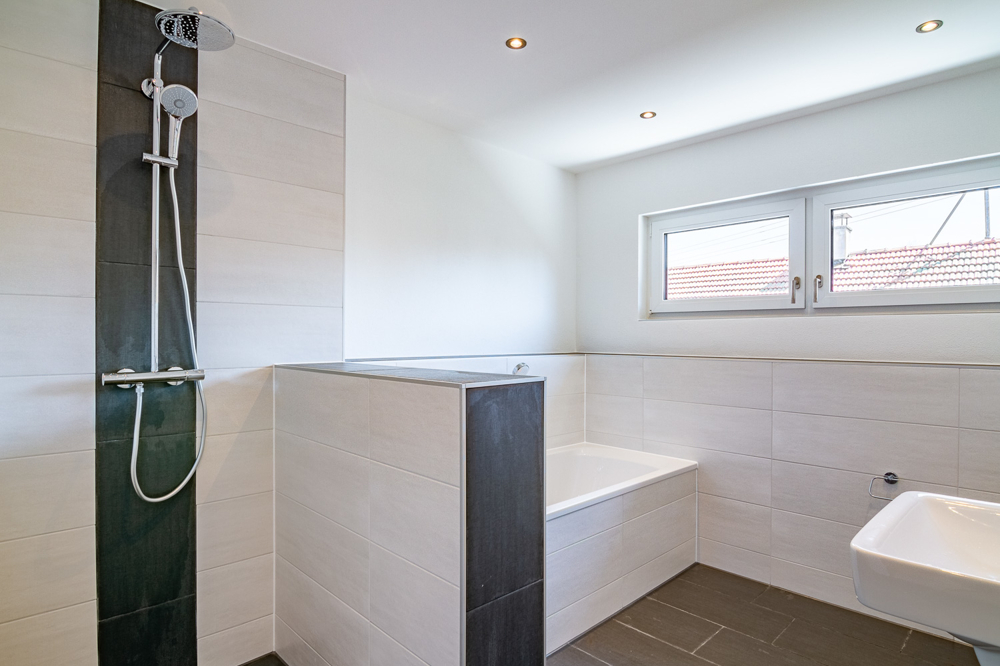 *Sanitäre Ausstattung u. a. mit bodenebener Duschanlage und Glasabtrennung, Badewanne, Urinal