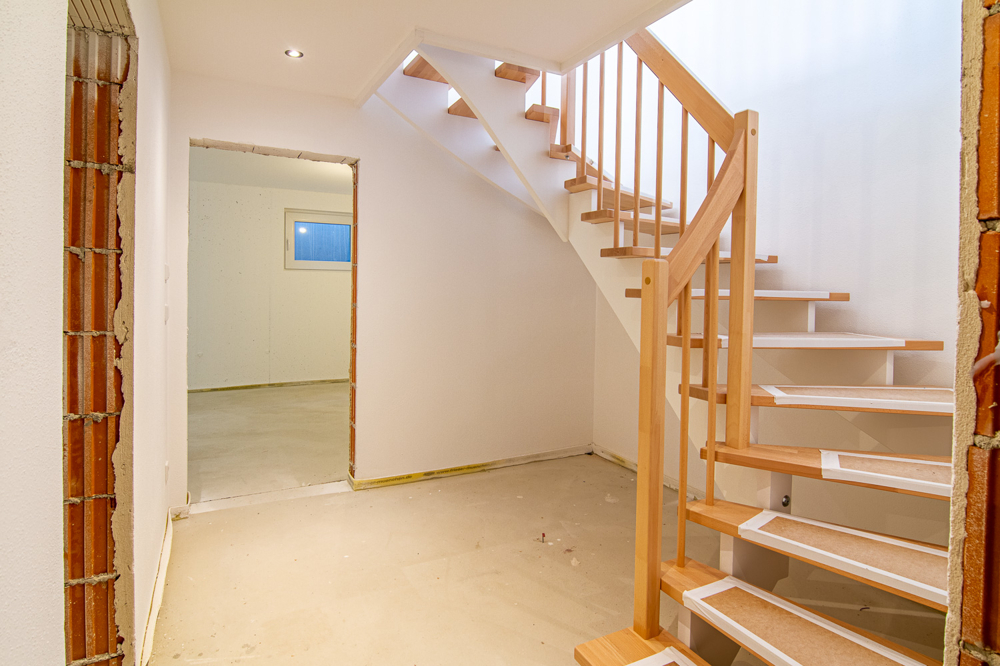 *Vollholztreppen: Stufen und Treppengeländer in Buche massiv, Wangen weiß lackiert