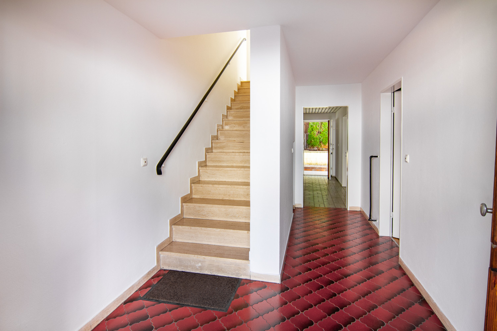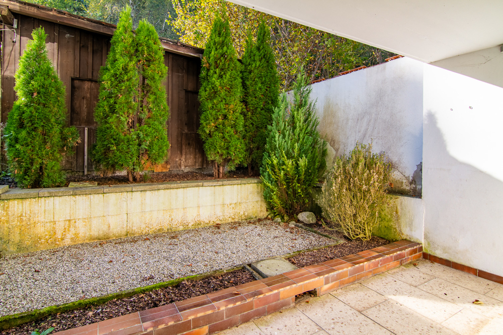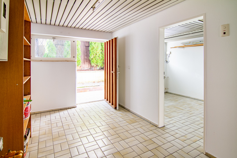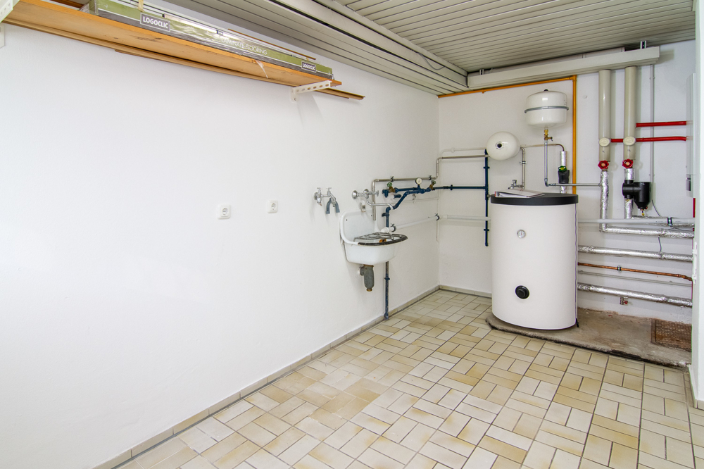 Im hellen Heizungs- und Hauswirtschaftsraum ist reichlich Platz für Waschmaschine und Wäschetrockner (siehe Grundriss) und sonstige Wirtschaftsgeräte. Der benachbarte ebenfalls helle Kellerraum bietet Platz für Allerlei und Zugang zur kleinen Terrasse.
