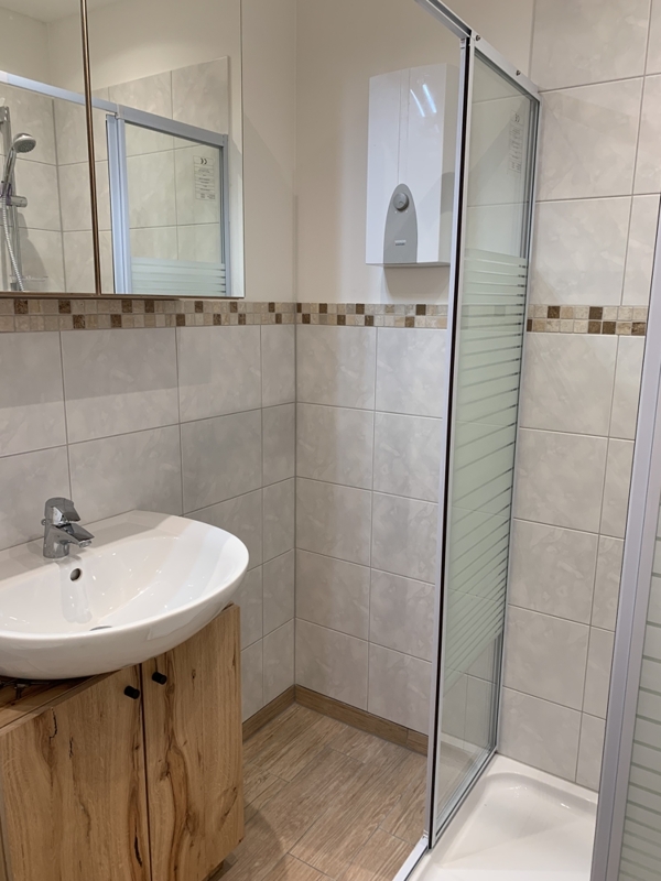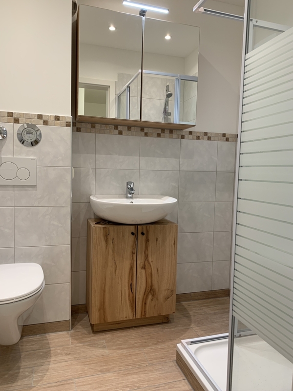 Sonstiges: Wandfliesen weiß-grau meliert mit Bordüren, Dusche Eckeinstieg, Waschbecken mit Unterschrank, Spiegelschrank, Handtuchtrockner, WC, Belüftung