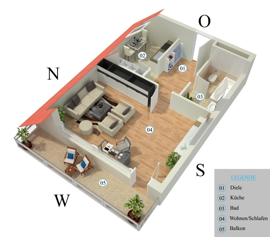 *Es besteht die Möglichkeit, aus dem jetzigen 1-Zimmerapartment mit Küche und Bad eine 2-Zimmerwohnung zu gestalten, so dass ein separates Schlafzimmer zur Verfügung steht. Lassen Sie sich beraten.