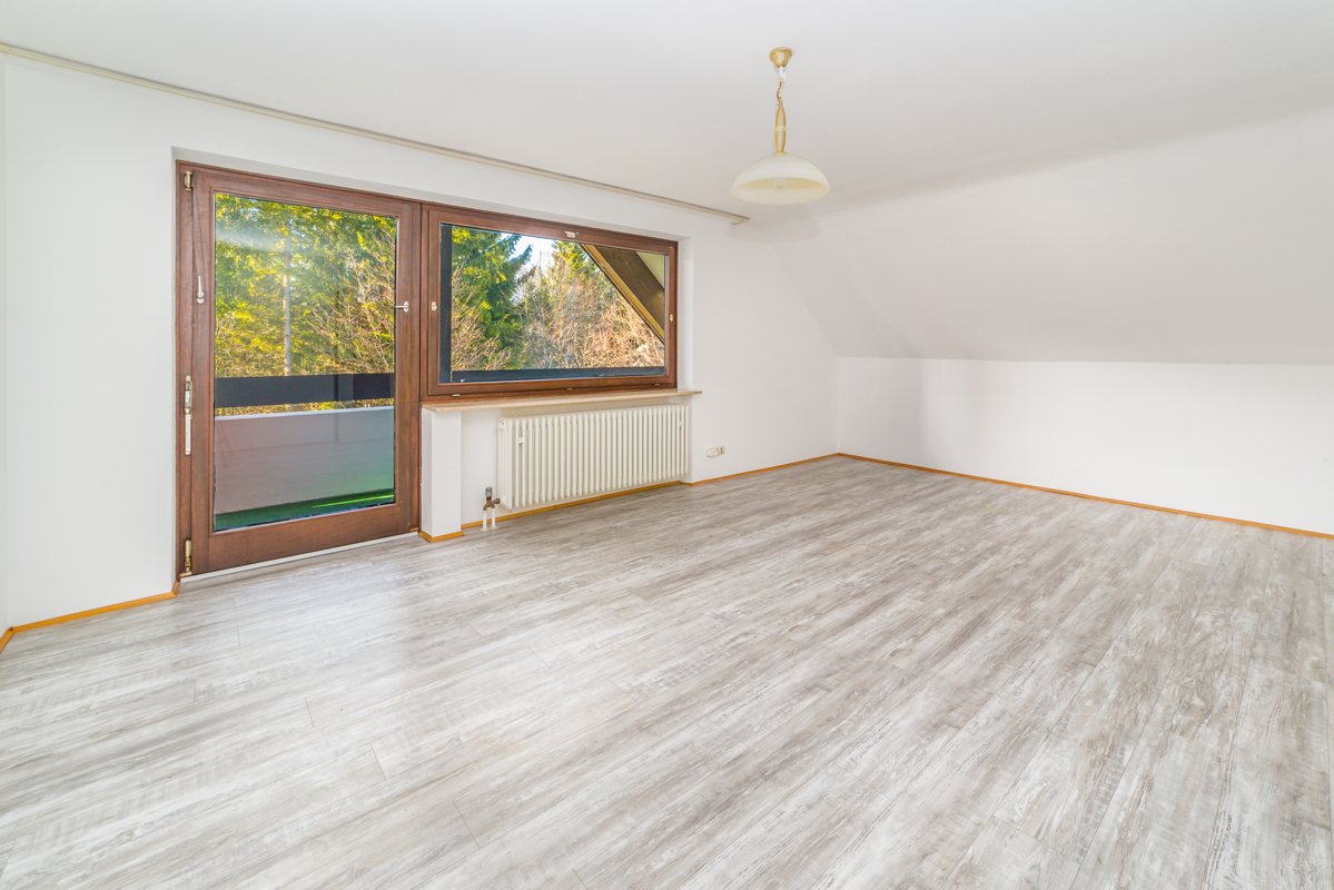 Sonstiges: Große Fenstertürenfront auf der Westseite mit Zugang zum Balkon, Laminatboden, Mansarde nordseitige Wand
