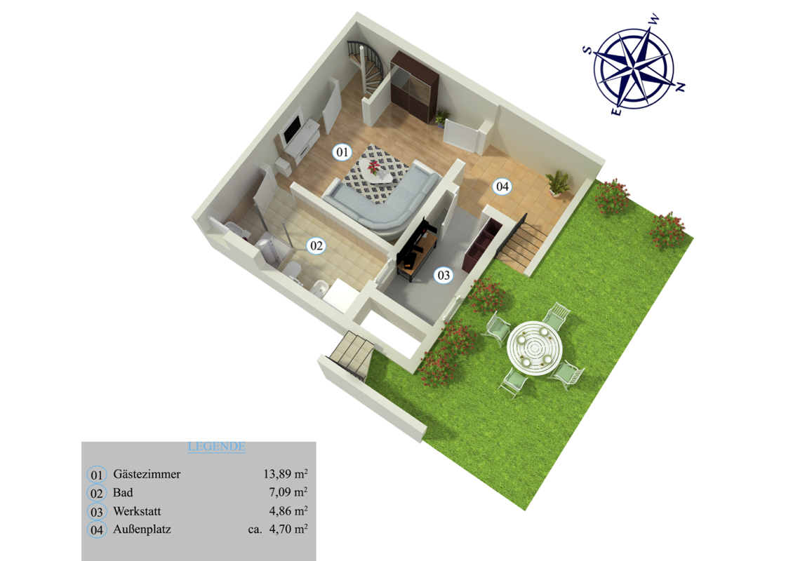 Das Gästezimmer im Souterrain kann über eine Wendeltreppe im Wohn- zimmer erreicht werden, verfügt jedoch auch über einen eigenen Eingang zum Garten.