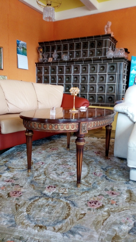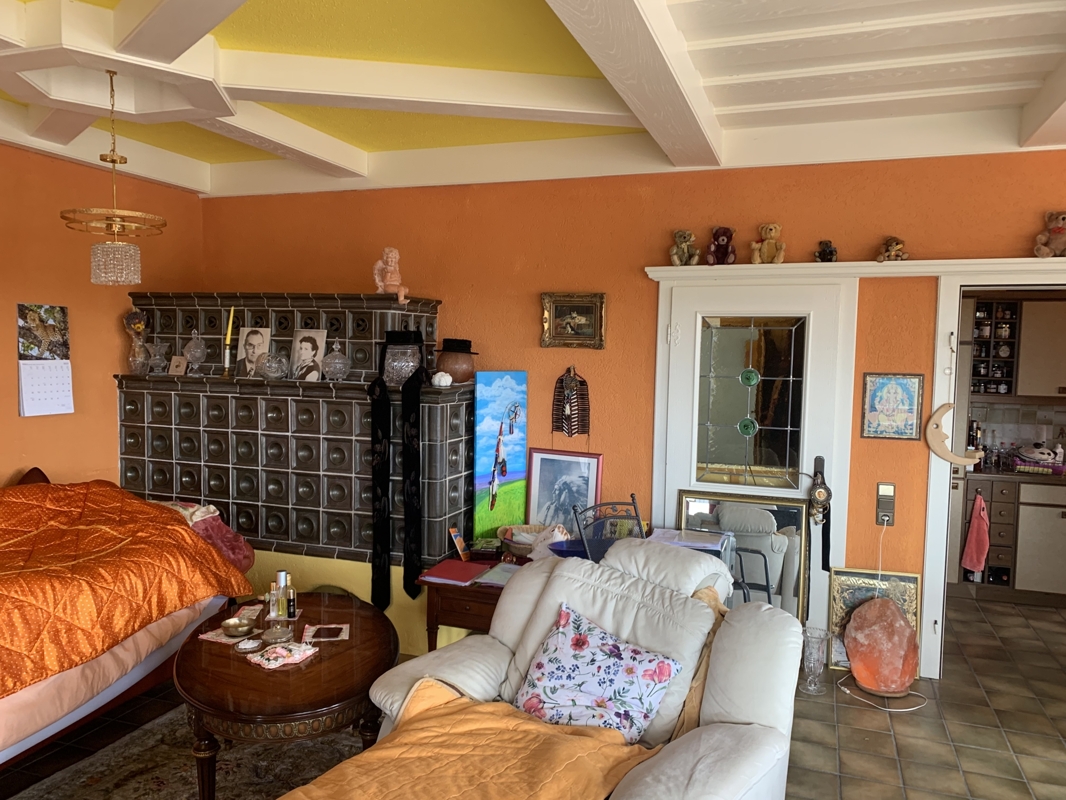 - Wohnraum mit ca. 50 m² mit heller Holzdecke und Tür zur großen Terrasse, sowie einem großem Kachelofen