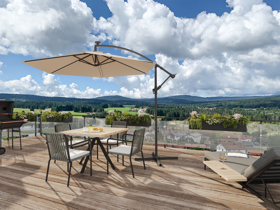 Auf der obersten 5.Etage erstreckt sich das Appartement über eine großzügige Wohnfläche von über 100 m² mit zuzüglich einer Dachterrasse mit über 35 m² - beides mit tollem Blick über den Bayerischen Wald!
