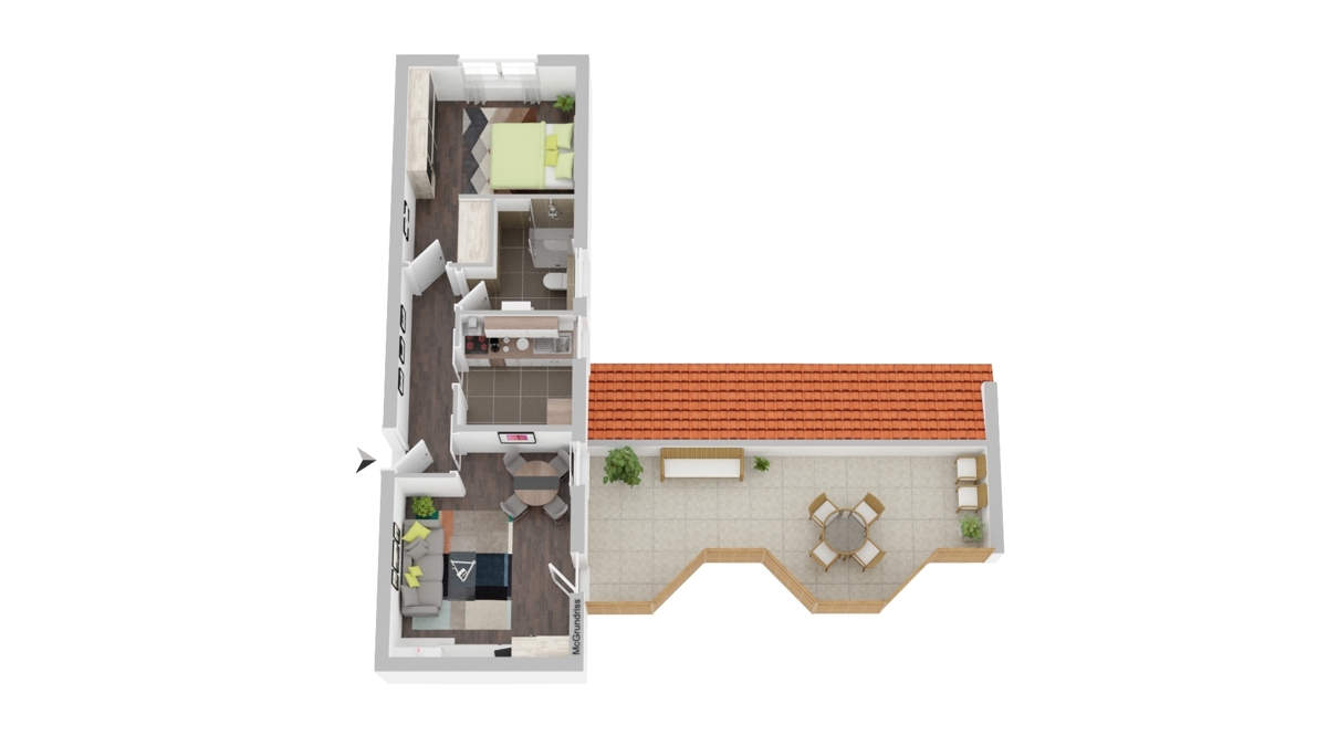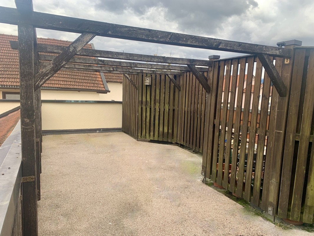 Die Wohnung bietet- ein 16,7 qm großes Wohnzimmer mit Zugang zur Dachterrasse mit 28 qm und Steinteppich