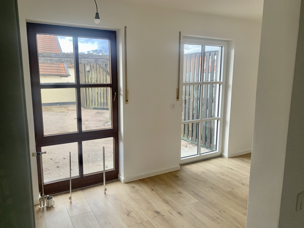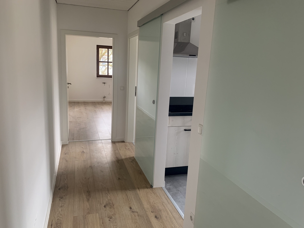 Der Zugang vom Flur in die Küche und das Wohnzimmer ist mit neuen Glasschiebetüren ausgestattet.