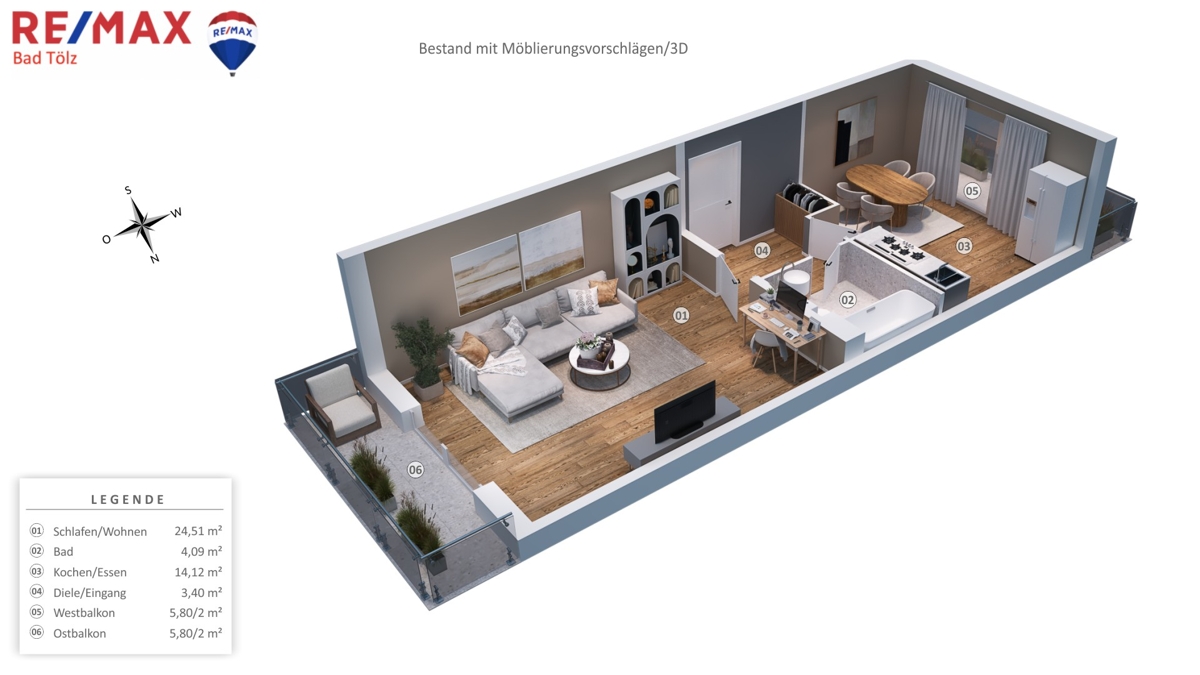 Alle Angaben sind ohne Gewähr und basieren ausschließlich auf Informationen, die uns vom Auftraggeber zur Verfügung gestellt wurden. Diese Immobilie wird im exklusiven Alleinauftrag angeboten. Mit der Anfrage auf dieses Objekt erklärt der Interessent seine ausdrückliche Einwilligung für die Kontaktaufnahme per Telefon oder E-Mail durch RE/MAX in Bad Tölz.