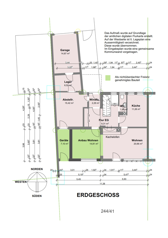 Die DHH ist real geteilt und ab sofort verfügbar.1984 wurde im Erdgeschoss ein Anbau getätigt: Eingangsbereich Garderobe, Flur, Garage, Vorraum/Lager, Abstellraum/Werkstatt). Bei dieser Gelegenheit wurde das Wohnzimmer auf der Westseite um ca. 19 m² erweitert; für den Wohnzimmerausbau fehlt jedoch die Genehmigung. Diese Fläche wurde deswegen weder im Kaufpreis noch in der Wohnfläche berücksichtigt. Nach Rücksprache mit einem Architekten ist eine nachträgliche Genehmigung vom Wohnzimmeranbau möglich, wenn die Abstandsflächen zur Grundstücksgrenze eingehalten werden.