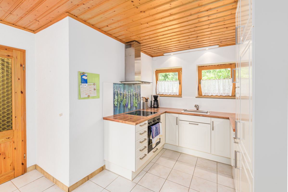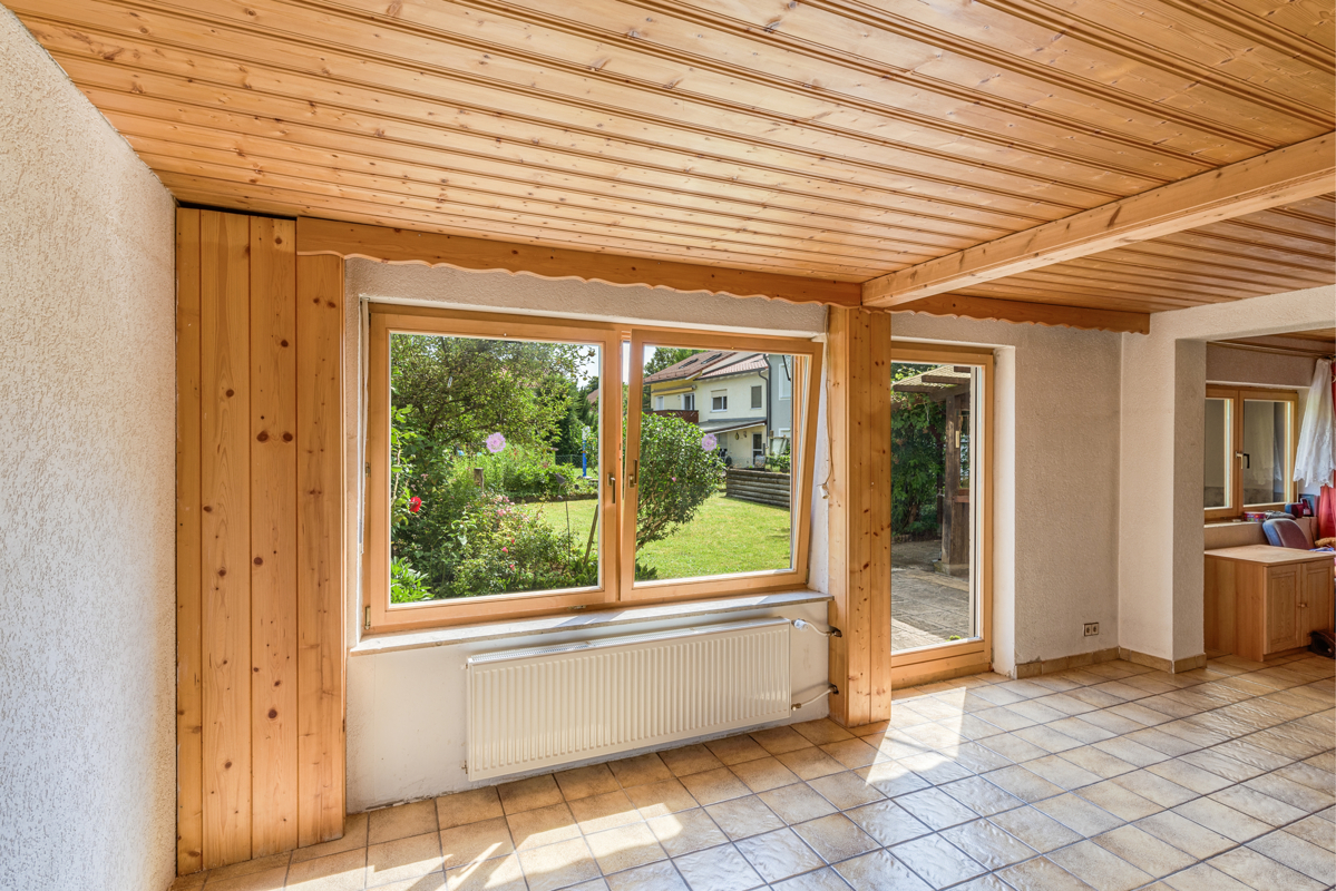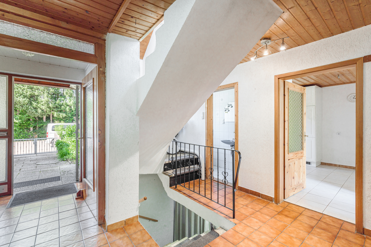 Im Erdgeschoss befinden sich im Eingangsbereich ein Flur mit eingebautem Garderobenschrank, ein Gäste-WC, eine Wohnküche, ausgestattet mit moderner Einbauküche und Platz für eine Essecke sowie ein Wohnzimmer mit Kachelofen und Zugang zur Südterrasse. Eine Garage mit Vorraum, Werkstatt (Abstellraum), Flur und Garderobe wurden 1982 auf der Westseite des Hauses angebaut.