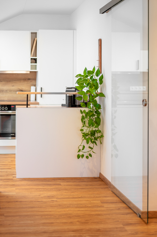 Einbauküche mit Theke und Elektrogeräten: Backofen, Ceranfeld, Dunstabzug, Kühlschrank, Gefrierschrank, Spülmaschine