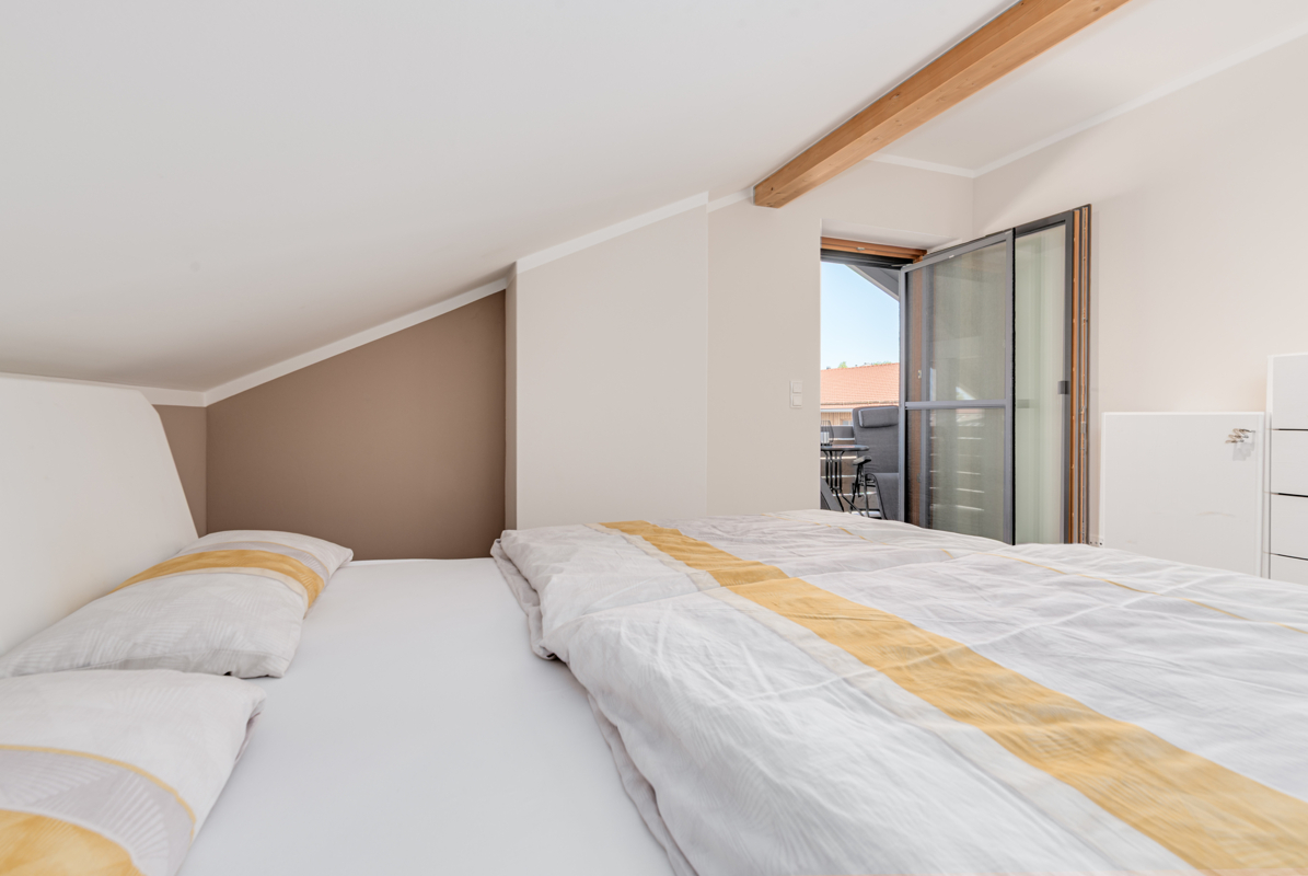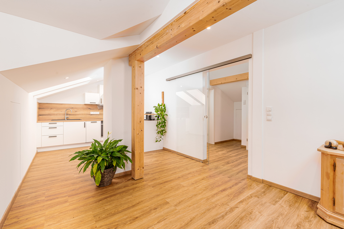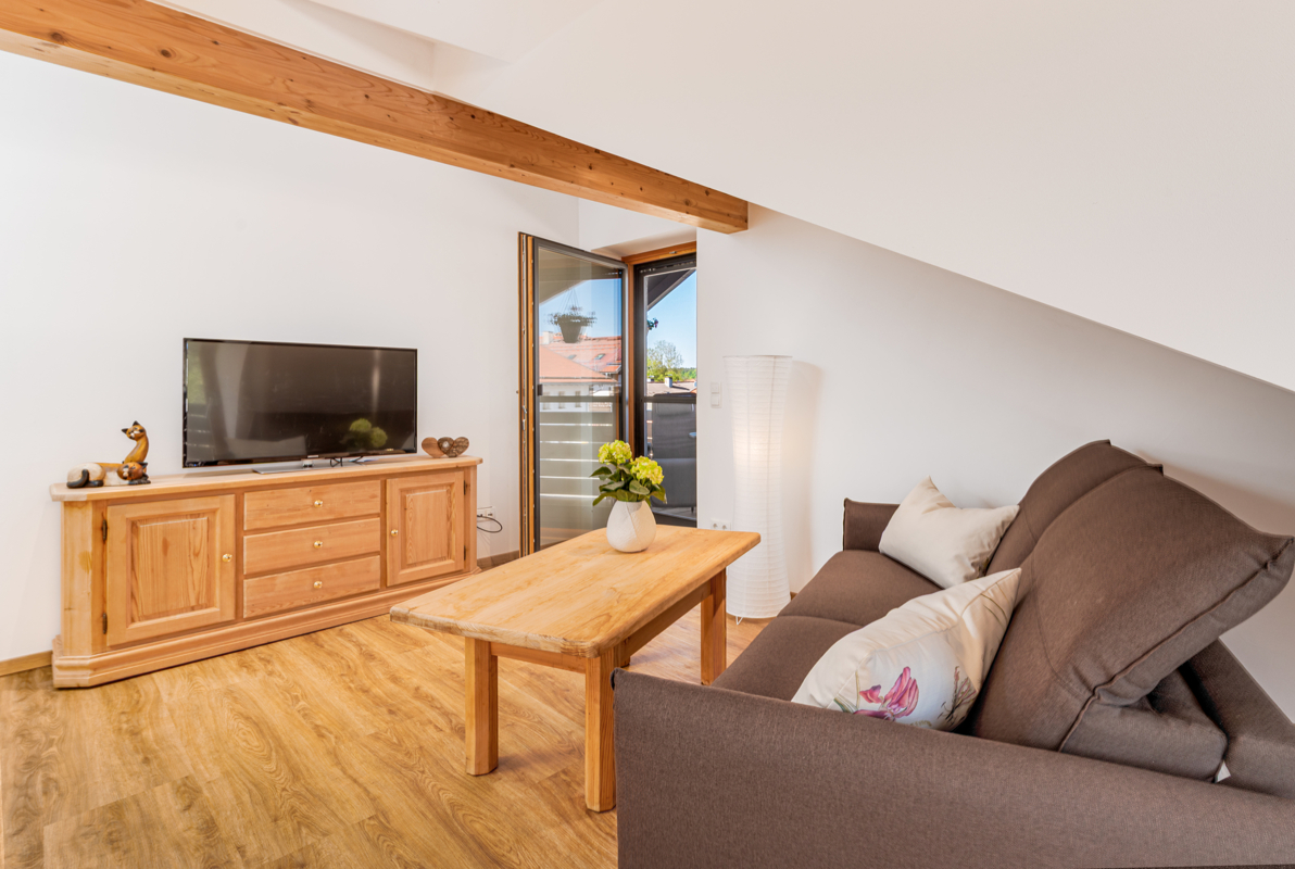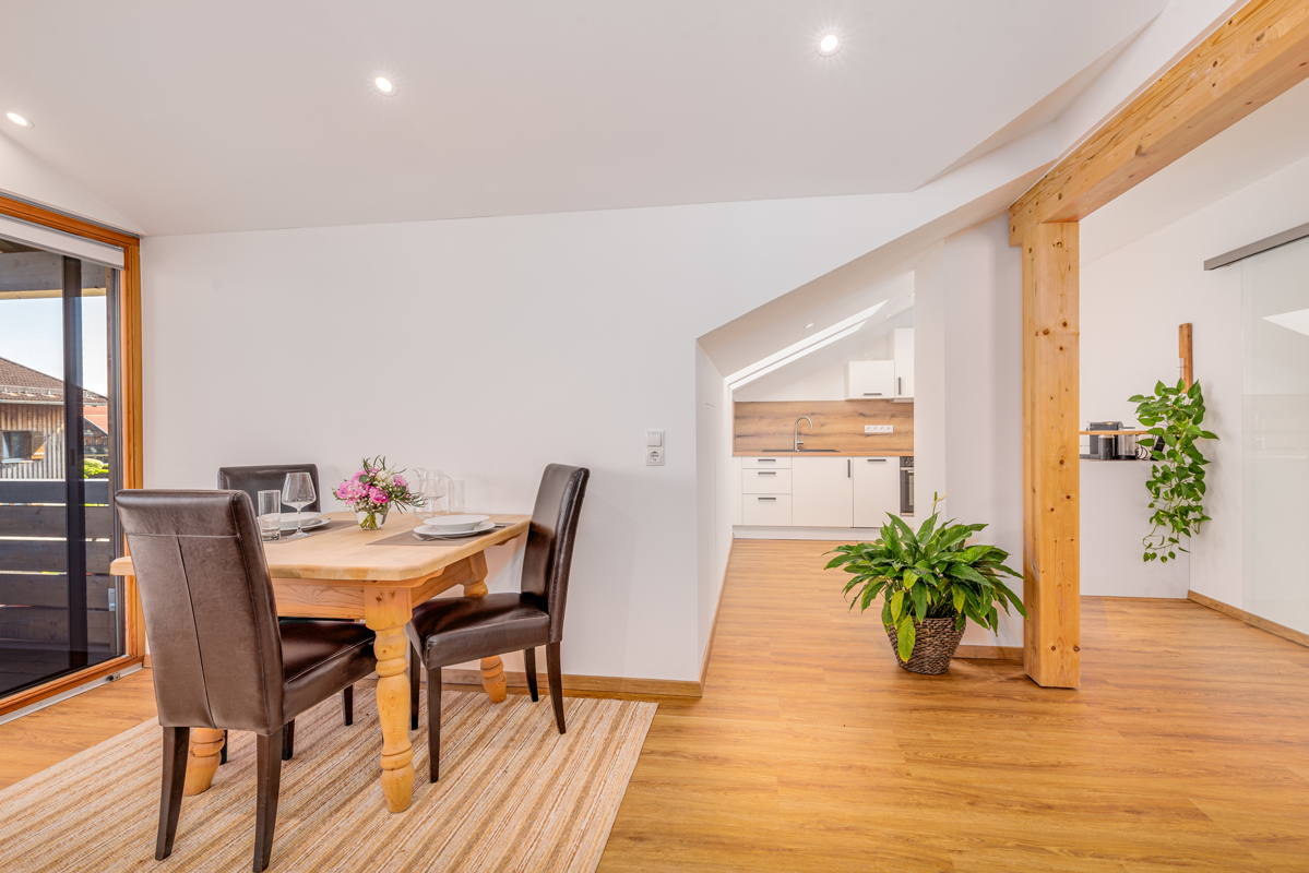 Diese exklusive Dachgeschosswohnung in Sachsenkam am Kirchsee, Nähe Bad Tölz, bietet eine einzigartige Kombination aus modernem Wohnkomfort und ländlicher Idylle. Die Wohnung befindet sich in einem gepflegten und ruhigen Dreifamilienhaus und wurde 2022 neu erbaut; besonders hervorzuheben ist der großzügige und helle Koch-, Ess- und Wohnbereich.Das Schlafzimmer mit Balkontüre wie auch das Bad mit Dachflächenfenster inkl. Regensensor, begehbarer Dusche, Badewanne, Doppelwaschtisch, Waschmaschine und Wäschetrockner sind ebenfalls geräumig. Ein besonderes Highlight sind die beiden Balkone, einer auf der Ostseite (Morgensonne) und der zweite auf der Südseite mit Blick in die Berge.