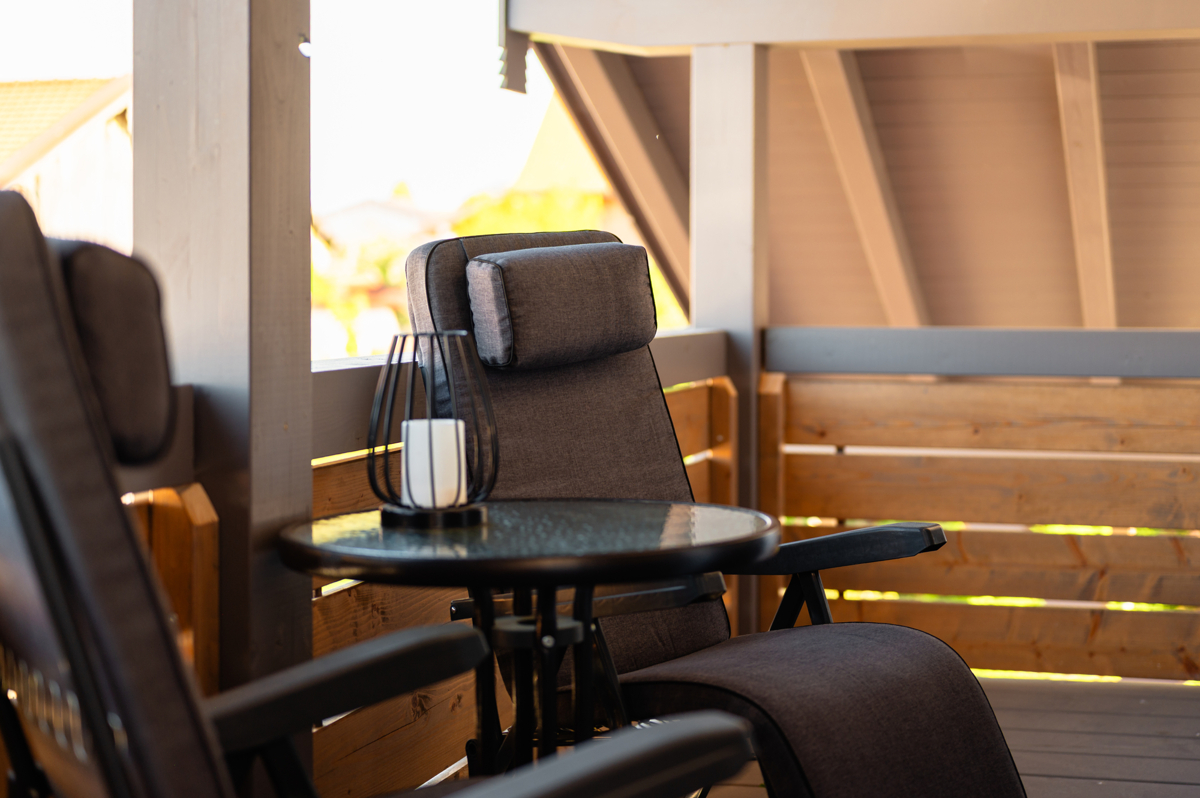 Mit 2 verstellbaren und gepolsterten Liegestühlen und kleinem Tisch