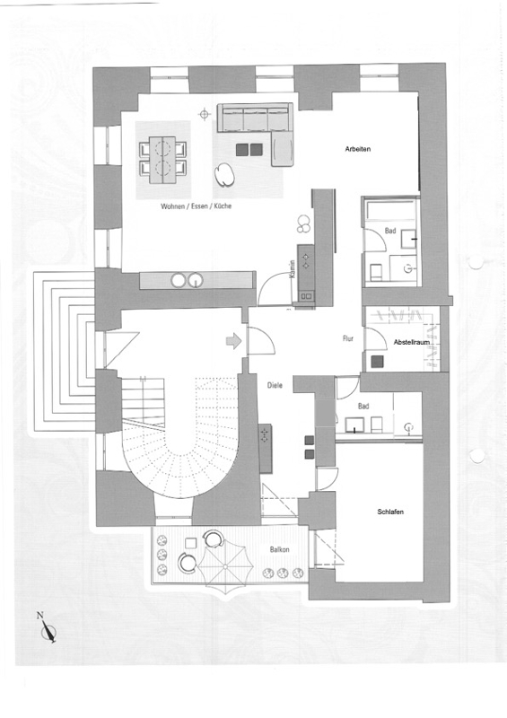 - ein ca. 54,5 qm großen Wohn-, Ess- und Küchenbereich, in dem eine offene Küche mit Eßbar, sowie ein angrenzendes Arbeitszimmer integriert sind
